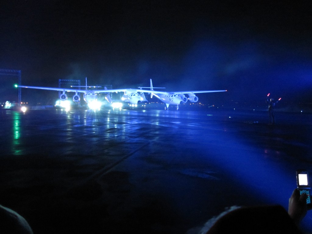Arnold Schwarzenegger dyker också upp. Och den känslan förstärktes av nästa ”super-evenemang” från Virgin Galactic – den s.k. roll-out av VSS Enterprise, det första exemplaret av SpaceShip Two vid Mojave Air & Spaceport i Kalifornien den 7 december 2009. Alla var där: bl.a. Karin Nilsdotter och naturligtvis någon från Ishotellet (har glömt vem, troligen Dan Björk) komplett med isbar. Alla inblandade på Virgin Galactic och Scaled Composites och Kaliforniens guvernör Arnold Schwarzenegger, som också höll ett anförande, som han naturligtvis avslutade med ”I’ll be back”. Alltihop skedde i ett tält, men vädret var verkligen ruskigt. Blåst. Kyla, regn och mörker. Rymdskeppet hängande under bärflygplanet rullades ut ur hangaren trots det förfärliga vädret. När sen vinden friskade i släpade man in de två farkosterna i hangaren igen och jag lyckades komma med den första bussen därifrån. Såvitt jag förstår började det stora festtältet att bli illa skadat lite senare. Var detta tecken ”i skyn” på att lyckan började vända för Virgin Galactic?