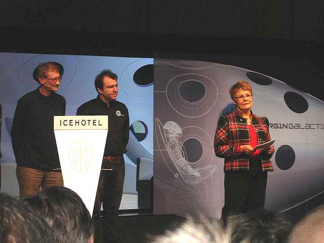 Maud Olofsson stiger in på arenan och Kenneth rockar loss. Vi blev så tagna av evenemanget i New York att vi svenskar och Virgin Galactic beslöt oss för att ordna en liknande tillställning i Kiruna i jättehangaren Arena Arctica den 25 januari 2007. Virgin flög dit fullskaleattrappen av rymdskeppets kabin och där var också den relativt nytillträdda näringsministern Maud Olofsson och Bengt Söderqvist, en svensk bosatt i Karibien som betatalt Virgin Galactic handpenning på en biljett att flyga ut i rymden. Nu hade bolaget Spaceport Sweden med bl.a. Rymdbolaget och Ishotellet som delägare bildats och ett treårigt samarbetsavtal med Virgin Galactic skrevs under av Will Whitehorn och Rymdbolagets vd Claes-Göran Borg. Karin Nilsdotter, en envis entusiast, blev vd för bolaget.