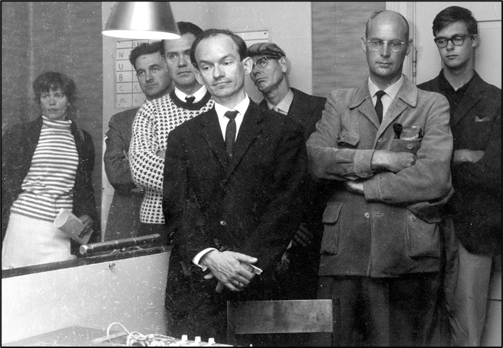 Figur 1 Fr.v.: Okänd, professor Bert Bolin (SU,meteorologi, IPCC:s förste ordförande),okänd, Jan Stiernstedt (RS 1:e chef), Prof Lamek Hulthén (KTH, matematisk fysik), Lars Brising (Saab), hans son Dag Brising. Kronogård 1964, ledningscentralen i mangårdsbyggnaden). Foto Lars Lundquist, Rymdtekniska Gruppen.