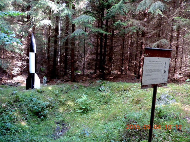 Ah, här är nedslagskratern och modellen i V-2-skala (gjord av glasfiber?) och en annan skylt.
