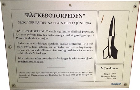 Historien om V-2-raketen som kom på avvägar och slog ner i Sverige den 13 juni 1944 är väl känd och återberättad i många källor. Jag kommer bara att sammanfatta grundläggande fakta, beskriva ett besök (september 2015) vid nedslagsplatsen och lägga till några roliga anekdoter som relaterar till denna händelse.